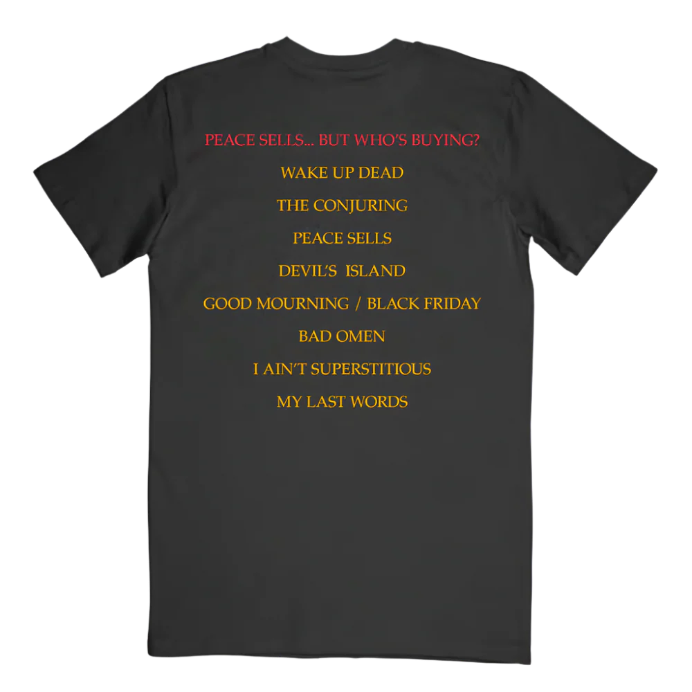 The Peace Sells Tracklist T-Shirt features short sleeves, ribbed crewneck collar, and a screen printed front/back design with artwork inspired by the acclaimed album Peace Sells... but Who's Buying?