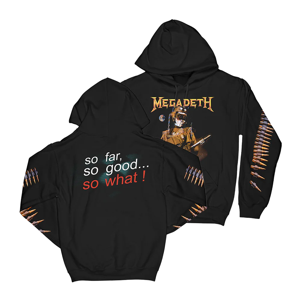 The So What Vintage Hoodie features a front pouch pocket, flat drawcord, lined hood, and screen printed front/back and sleeve designs with artwork inspired by the acclaimed album So Far, So Good... So What!